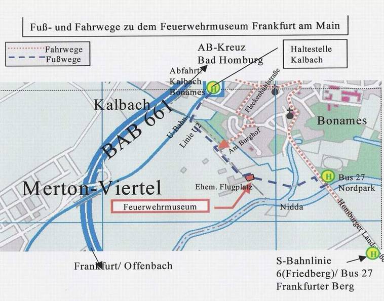 | U-Bahn, Station Kalbach, Fußweg ca. 10 Minuten entlang der Bahn über den Kalbach zum alten Flugplatz. |